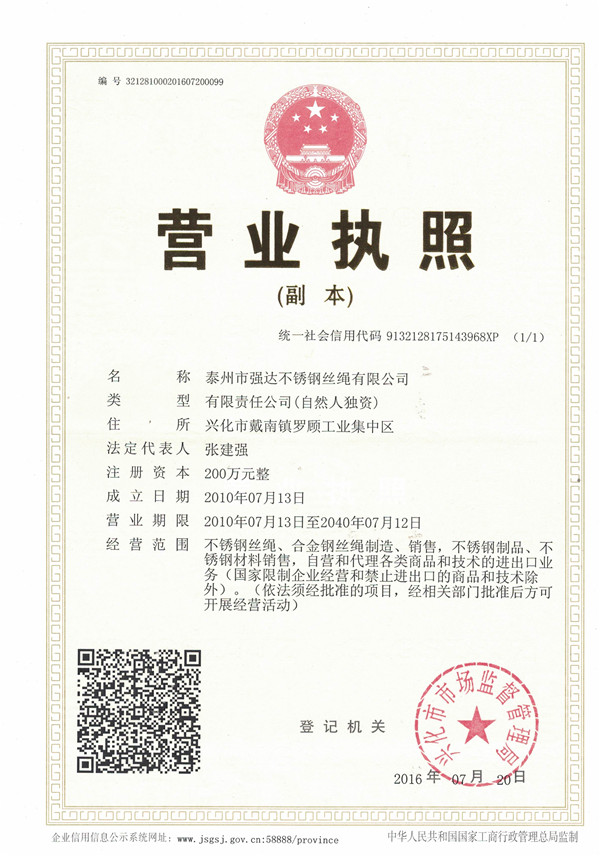 泰州市強(qiáng)達(dá)不銹鋼絲繩有限公司位于江蘇興化市戴南經(jīng)濟(jì)開發(fā)區(qū),公司致力于不銹鋼絲繩產(chǎn)品生產(chǎn),立志成為“國內(nèi)技術(shù)標(biāo)桿型吊索具生產(chǎn)企業(yè)”。以此戰(zhàn)略思想指導(dǎo),公司堅(jiān)決貫徹“質(zhì)量贏市場(chǎng),管理增效益,誠信贏天下”的質(zhì)量方針。以完善的服務(wù)在國內(nèi)不銹鋼絲繩市場(chǎng)樹立良好的品牌形象。公司榮獲“江蘇省質(zhì)量信得過企業(yè)。     靈活的管理機(jī)制,經(jīng)驗(yàn)豐富的